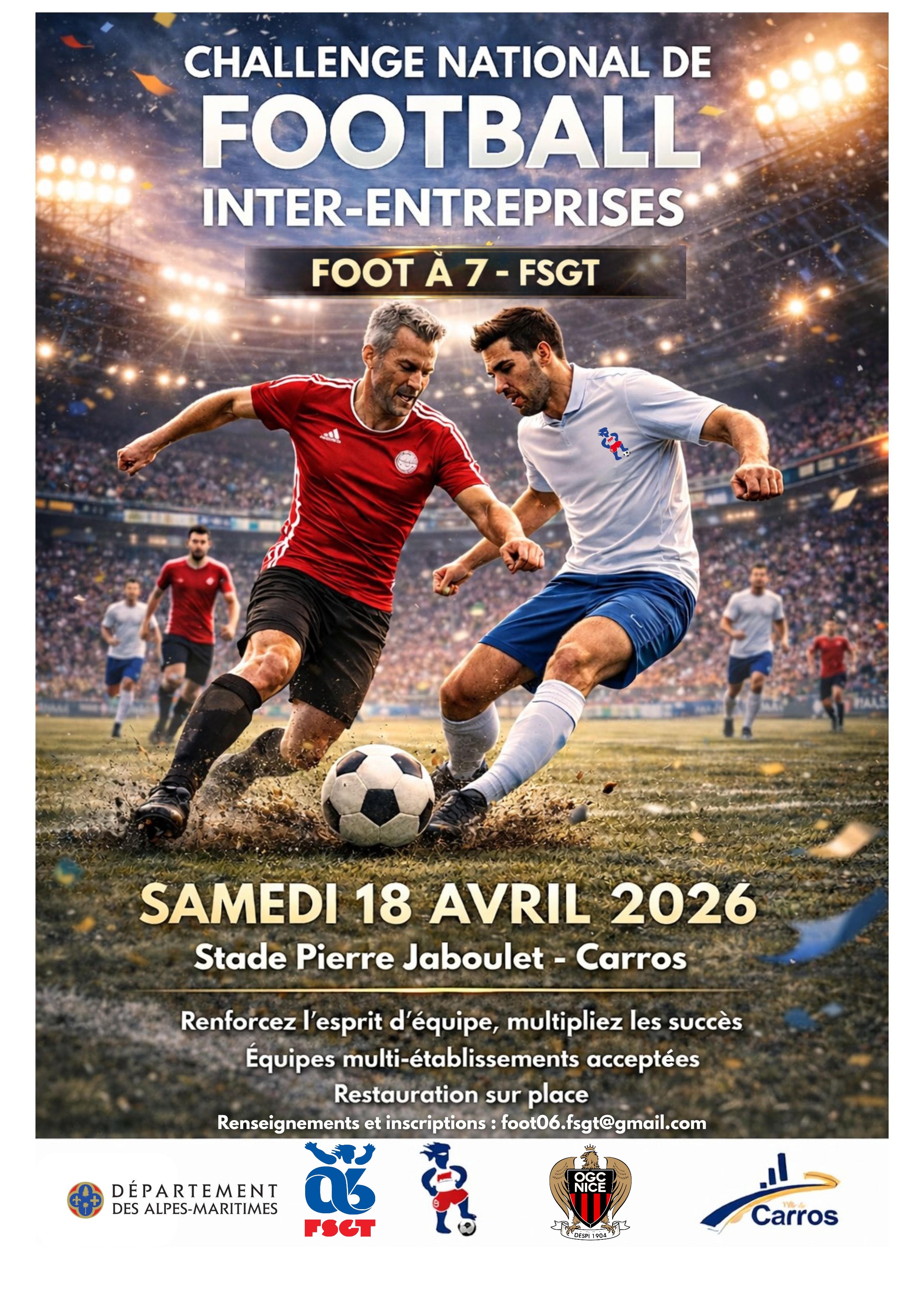 Comme tous les ans, la FSGT organise son traditionnel Challenge de Foot à 7 qui aura lieu le samedi 18 Avril à Carros.